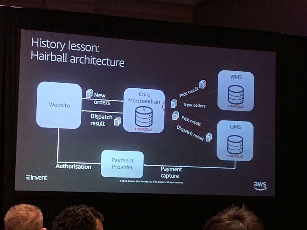 Charles Wilkinson from well known UK retailer River Island then came up while things were deploying in the background. He went though the history of River Island IT. They had a customer Core Merchandising System (CMS) which was a typically large monolith purchased and then customised, making it harder to upgrade. Lots of large Oracle databases. The backend ended up being broken apart into smaller parts as its seemed as easer but the business logic end up having its gravitational pull and updating it become scary, there was baggage. There were lots of batch jobs and things were clunky, slow and not as scalable. Serverless of course to the rescue and they managed to refactor a lot of their processes