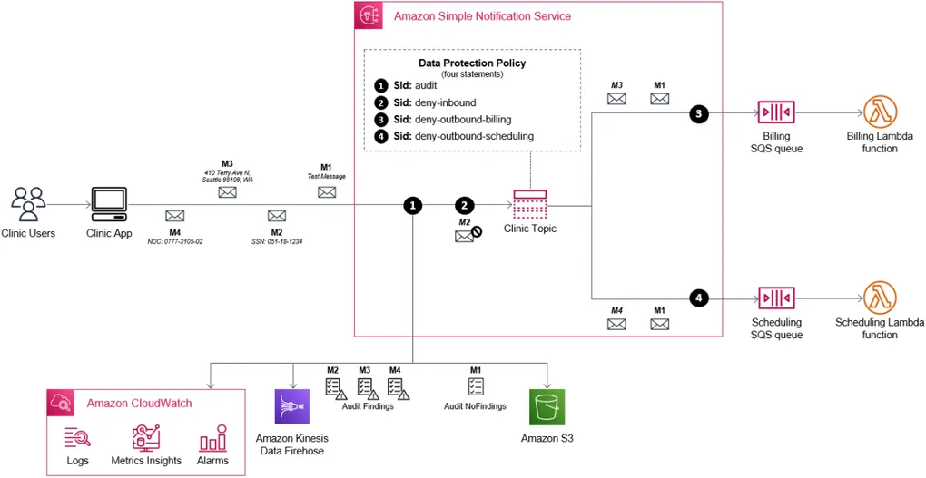 This post shows how message data protection enables a topic owner to discover and protect sensitive data that is exchanged through SNS topics. The example shows how to create a data protection policy that generates audit reports for sensitive data and blocks messages from delivery to specific subscribers if the payload contains sensitive data.